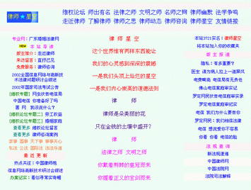 【律师星空】部分历史内容: 师出有名:介绍律师制度起源、律师资格考试、国家司法考试。 法学名著:西方法学名著简介。 法学争鸣:我国改革开放以来法学理论争鸣简介。 律师周评:1999年7月至2000年12月的律师周评,现在看起来内容比较粗糙。 律师咨询: 如下为1999年11月至2002年12月的历史咨询及解答: 律师咨询28(2002年12月)律师咨询27(2002年11月)律师咨询26(2002年10月) 律师咨询25(2002年09月)律师咨询24(2002年08月)律师咨询23(2002年07月) 律师咨询22(2002年06月)律师咨询21(2002年05月)律师咨询21(2002年04月) 律师咨询19(2002年03月)律师咨询18(2002年02月)律师咨询17(2002年01月) 律师咨询16(2001年12月)律师咨询15(2001年11月)律师咨询14(2001年10月) 律师咨询13(2001年09月)律师咨询12(2001年08月)律师咨询11(2001年07月) 律师咨询十(2001.06-2001.06) 律师咨询九(2001.05-2001.05) 律师咨询八(2001.03-2001.04) 律师咨询七(2001.01-2001.02) 律师咨询六(2000.11-2000.12) 律师咨询五(2000.10-2000.10) 律师咨询四(2000.07-2000.09) 律师咨询三(2000.04-2000.06) 律师咨询二(2000.03-2000.04) 律师咨询一(1999.11-2000.02)